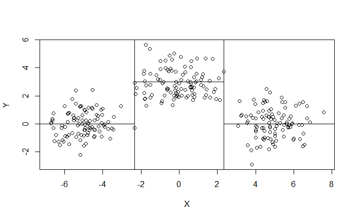 $$ \begin{align*} R_1 (t) = \{ X : X \leq t \} \quad \text{and} \quad R_2 (t) = \{ X : X > t \} \end{align*} $$此時同樣以最小化 SSE 為目標決定 $t$