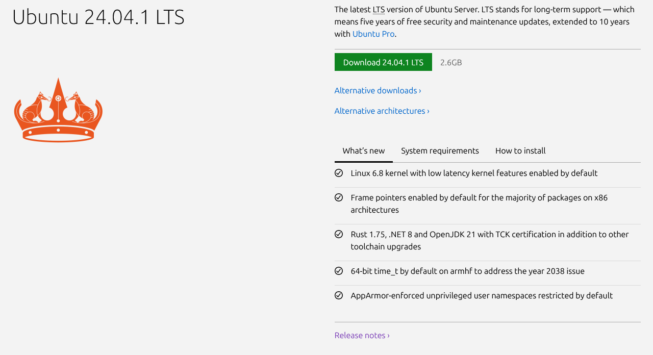 進入 Ubuntu 官網 下載 Ubuntu 24.04 LTS,其中的 LTS 是指長期支援版 (Long Term Support),一般會有 5 年的支援週期,會有定期的安全補丁。