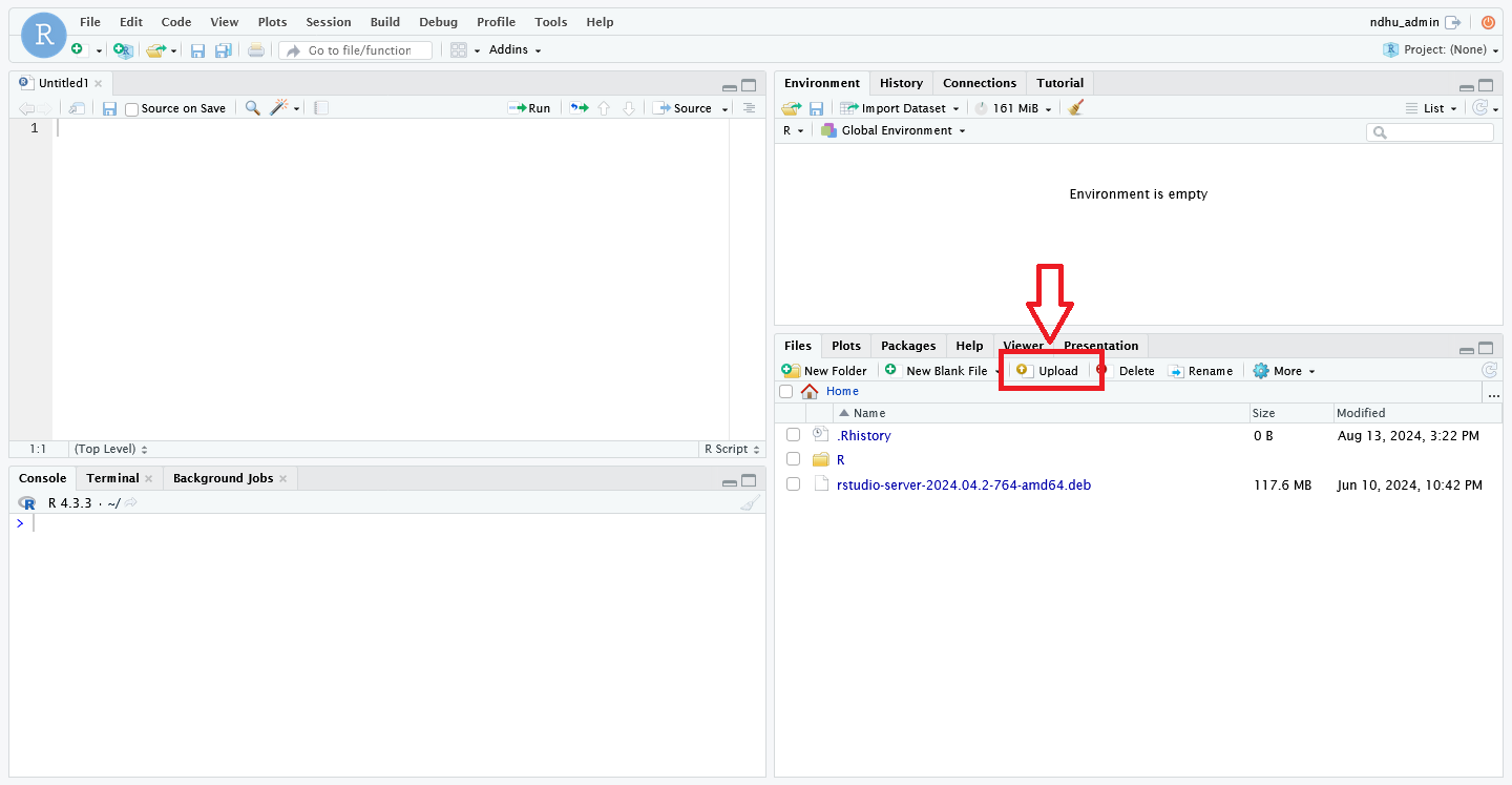 若要上傳檔案至 RStudio Server,點擊畫面右下角的 Upload,即可選定要上傳的檔案與上傳位置。
