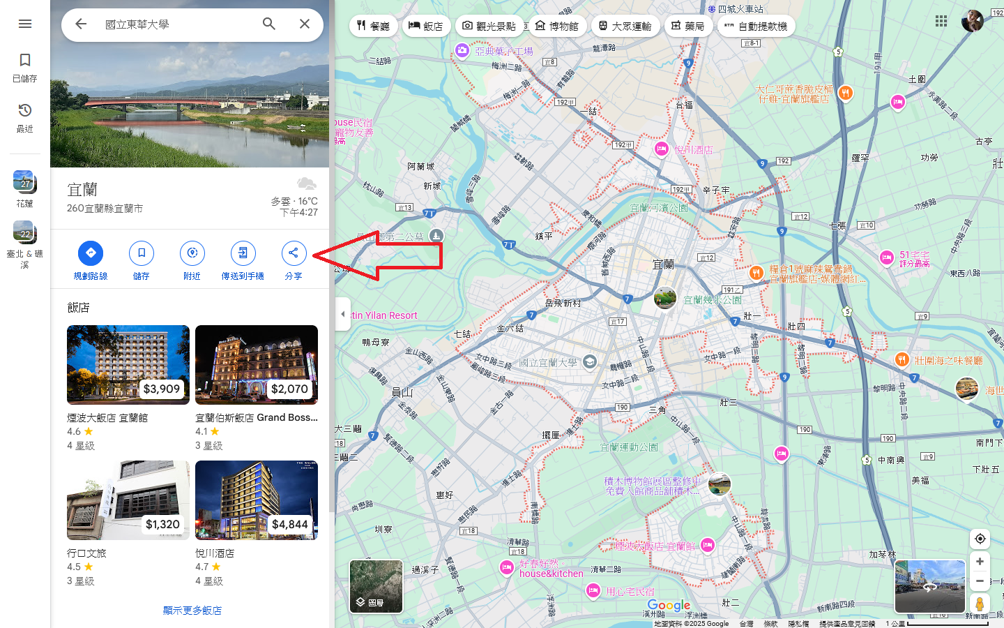 首先選擇指定地點,例如宜蘭。點選分享