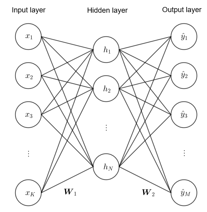 下圖展現的是一個多層類神經網路,$\bs x = (\contia{x}{K})$ 是輸入層,$\bs h = (\contia{h}{N})$ 是隱藏層 (hidden layer),$\hat {\bs y} = (\contia{\hat y}{M})$ 是輸出層;$\bs W_1 \in \bb R^{K \times N}$ 與 $\bs W_2 \in \bb R^{N \times M}$ 分別是輸入至隱藏層與隱藏至輸出層的權重