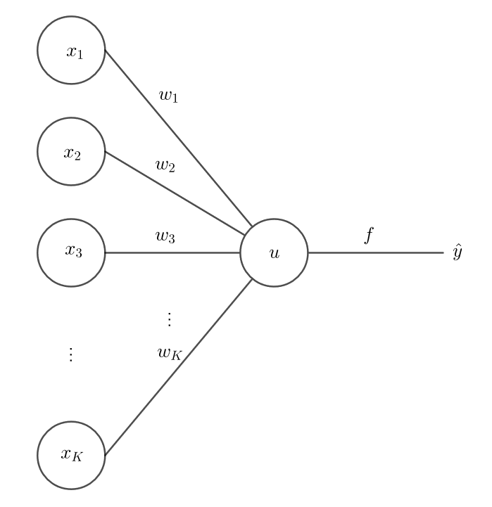 $$ \begin{align*} u = \bs w^T \bs x = \sum_{i = 0}^{K} w_i x_i \end{align*} $$並透過連結函數 $f$ 將 $u$ 轉換成輸出