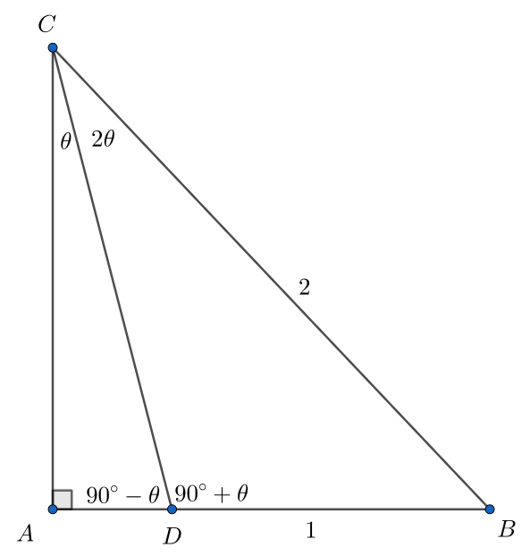$$ \begin{align*} && \frac{\overline{BC}}{\sin (\angle BAC)} & = \frac{\overline{AB}}{\sin (\angle ACB)} \\ \Rightarrow && \frac{2}{\sin (90 \degree)} & = \frac{1 + \overline{AD}}{\sin (3 \theta)} \\ \Rightarrow && \overline{AD} & = 2 \sin (3 \theta) - 1 \\ \end{align*} $$其中的 $\sin (3\theta)$ 也能直接推論