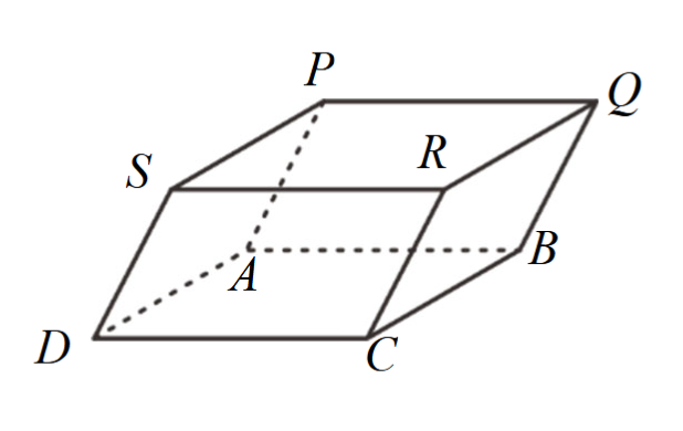 (18 ~ 20 題目為題組) 坐標空間中有一平行六面體 $PQRS - ABCD$,如圖所示。已知 $\overrightarrow{AB} \times \overrightarrow{AD} = (-5, 5, 5)$、$\overrightarrow{AD} \times \overrightarrow{AP} = (-2, 0, -4)$、$\overrightarrow{AP} \times \overrightarrow{AB} = (6, -10, -8)$,$\overline{AP} = 6$。試回答下列問題。