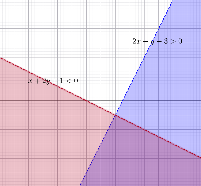 坐標平面上同時滿足 $ \begin{cases} 2x - y - 3 > 0 \\ x + 2y + 1 < 0 \end{cases} $ 的點 $P (x, y)$ 可能位在下列哪些選項?