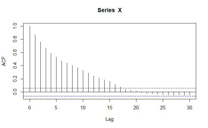 給定一維度資料 $\\{X_t\\}_{t = 1}^{n}$,能透過 R 語言內建的函式 acf (autocorrelation function) 繪製出 $\hat \rho_k$,圖中的 Lag 就是 $\hat \rho_k$ 的下標 $k$。