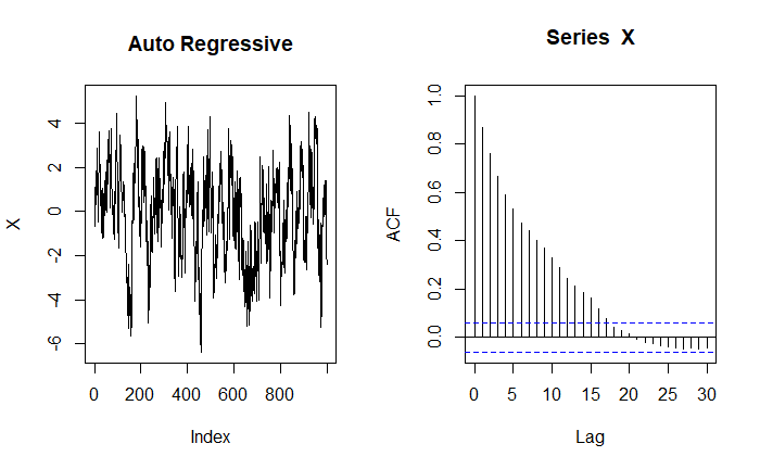 $$ \begin{align*} X_t = \phi X_{t - 1} + \varepsilon_t \end{align*} $$其中 $\\{\varepsilon_t \\} \sim WN (0, \sigma^2)$ 且一般 $\phi \in (-1, 1)$,則 $E (X_t) = 0$、$E (X_t^2) = \sigma^2 / (1 - \phi^2)$ 且