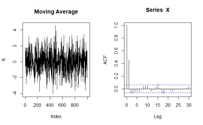 $$ X_t = W_t + \theta W_{t - 1} \quad \\{ W_t \\} \sim WN (0, \sigma^2) $$其中 $\\{\varepsilon_t \\} \sim WN (0, \sigma^2)$ 且一般 $\theta \in (-1, 1)$。則 $E (X_t) = 0$ 且