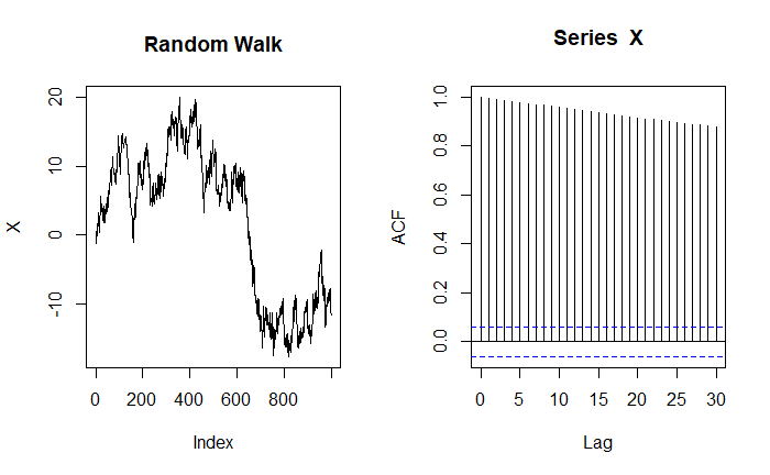 $$ X_t = \sum_{i = 1}^{t} \varepsilon_t, \quad \\{ \varepsilon_t \\} \sim WN (0, \sigma^2) $$則 $E (X_t) = 0$ 且 $\var (X_t) = t \sigma^2$;但 $\gamma (t, t + k) = t \sigma^2$ 並非 $t$ 獨立,因此 random walk 並非穩定的。
