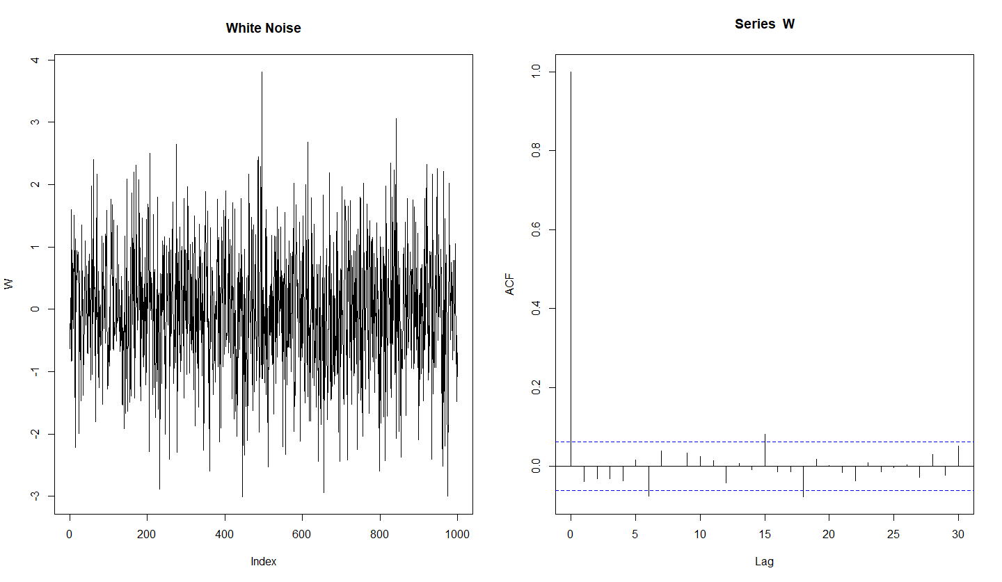 圖中的另一個特徵是藍色虛線,母體的 $\rho_1 = \rho_2 = \cdots = 0$,但採樣的 $\contiai{\hat \rho}$ 一般不會等於 $0$,而是會在 $0$ 附近徘徊,可以理解為「若 ACF 在 $0$ 附近徘迴且沒有特殊模式,則可以視為此資料的 $\rho = 0$。」